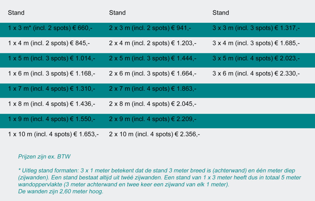 Pas in tweede instantie betaalt u de deelnamekosten. Deze zijn afhankelijk van de grootte van de stand en eventuele extra’s (aankleding van de stand).