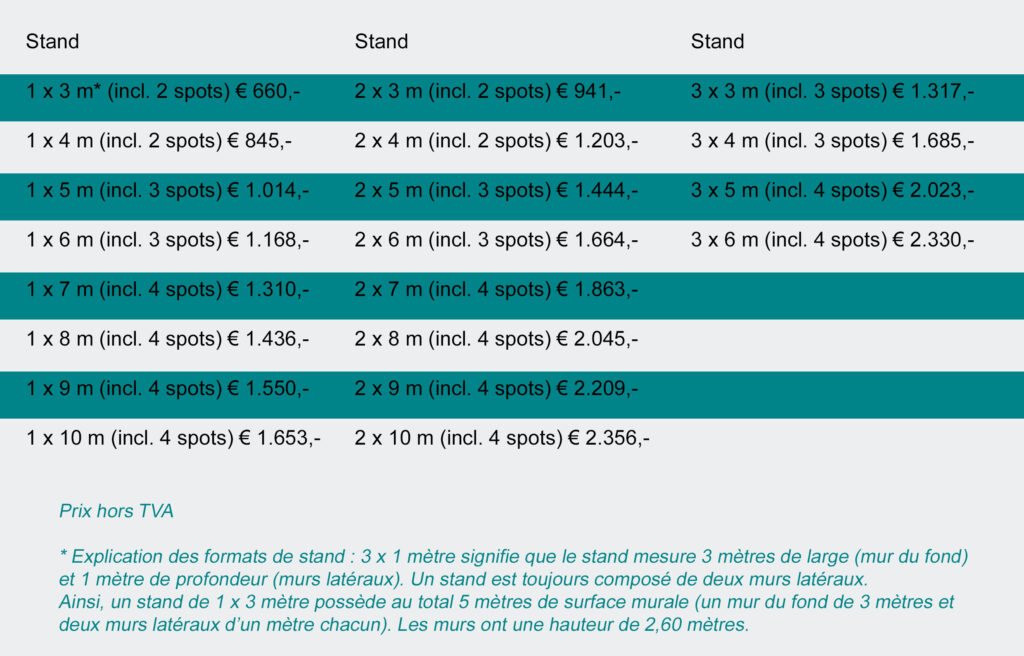 Vous ne paierez les frais de participation que dans un deuxième temps. Ceux-ci dépendent de la taille du stand et des suppléments éventuels (décoration du stand).